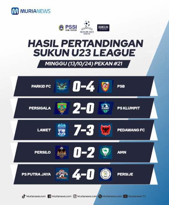 Murianews, Kudus – Lima laga seru tersaji di Liga 1 PSSI Kudus bertajuk Sukun U23 League pada Minggu (13/10/2024). Di mana tiga tuan rumah berhasil menang besar. Sedang dua tim tuan rumah lainnya harus terjungkal.