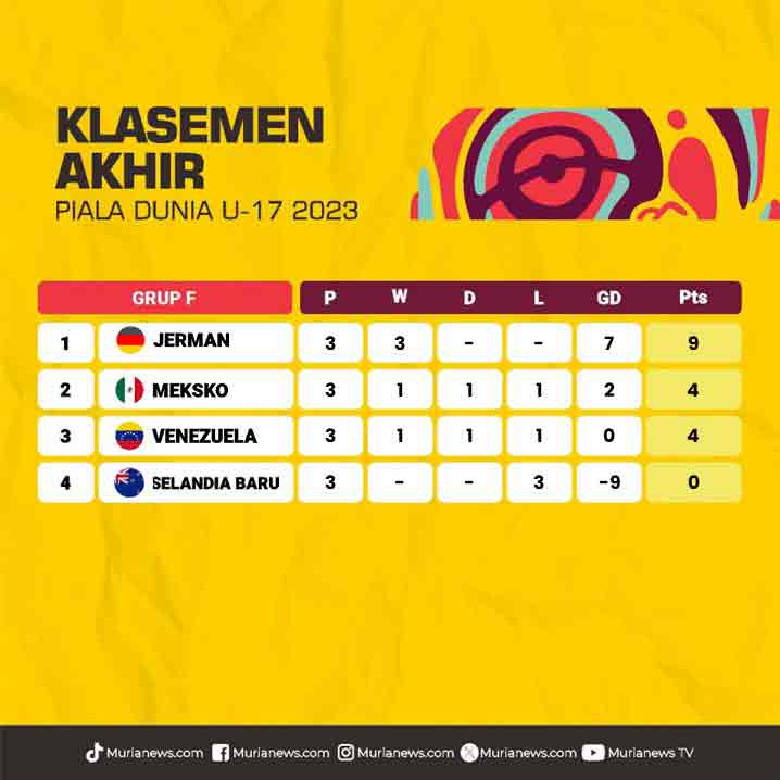 Sementara di pertandingan lain di Grup F, Jerman U17 tampil sempurna dengan menyapu semua kemenagan di fase grup. Mereka mengalahkan Venezuela dengan skor 3-0, di Stadion JIS, Sabtu (18/11/2023) pada jam yang sama.