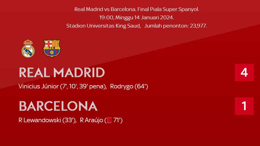 Pada El-Clasico pertama yang terjadi di 2024 ini, Real Madrid menegaska dominasinya atas Barcelona. Mereka menang 4-1 di Stadion King Saud Univercity, Saudi Arabia.