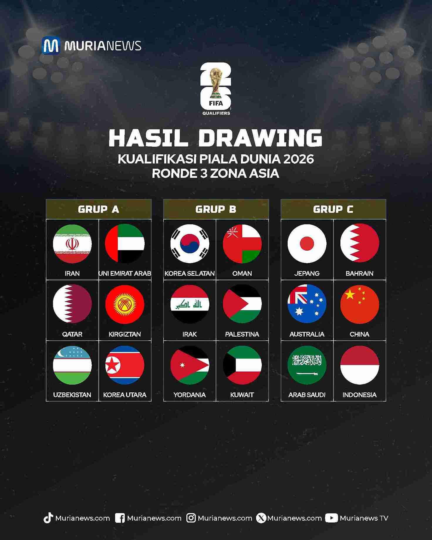 Murianews, Jakarta – Hasil drawing Kualifikasi Piala Dunia 2026 Zona Asia sudah dilakukan di Kualalumpur, Malaysia, Kamis (27/6/2024) siang. Timnas Indonesia dipastikan akan menghadapi sejumlah lawan berat.