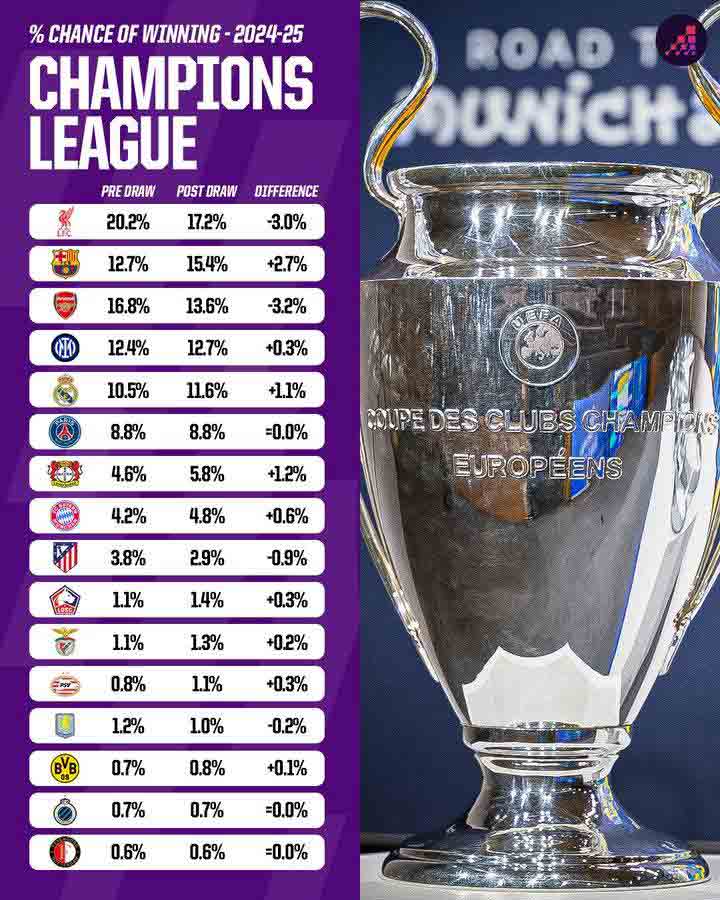 Berikut Prediksi Superkomputer Opta untuk Juara Liga Champions 2024/2025:
