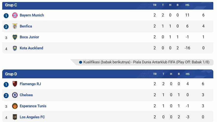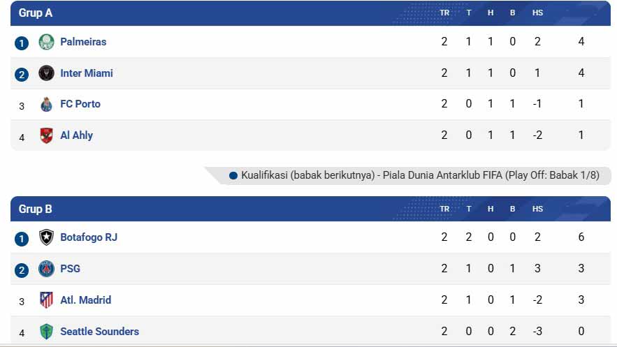 Murianews, Kudus – Pertandingan kedua penyisihan grup, telah memberi posisi sementara dari masing-masing tim yang bersaing di Klasemen Semetara Piala Dunia Antarklub 2025. Sejumlah klub dipastikan lolos ke Babak 16 Besar, namun di sisi lain juga ada yang tersingkir.