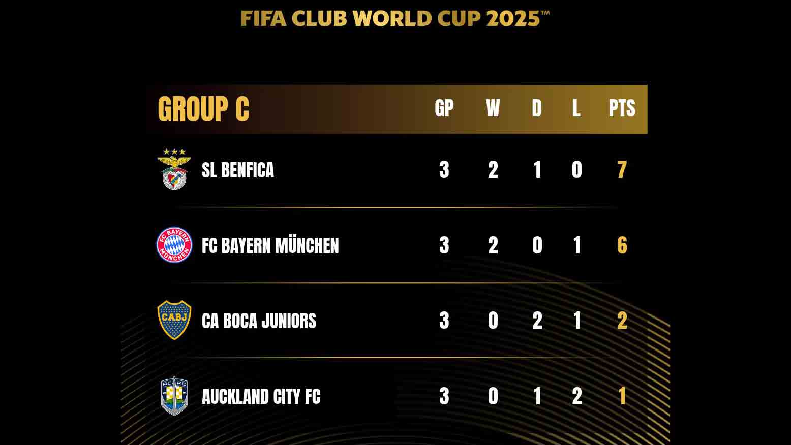Selanjutnya di Grup C, klub Benfica Portugal keluar sebagai juara Grup. Sementara runner-upnya adalah Bayern Munich. Kedua klub akan menghadapi wakil dari Grup D, Flamengo Brasil dan Chelsea. Benfica akan menghadapi Chelsea, sementara Bayern Munich vs Flamengo di Baba 16 Besar Piala Dunia Antarklub 2025.