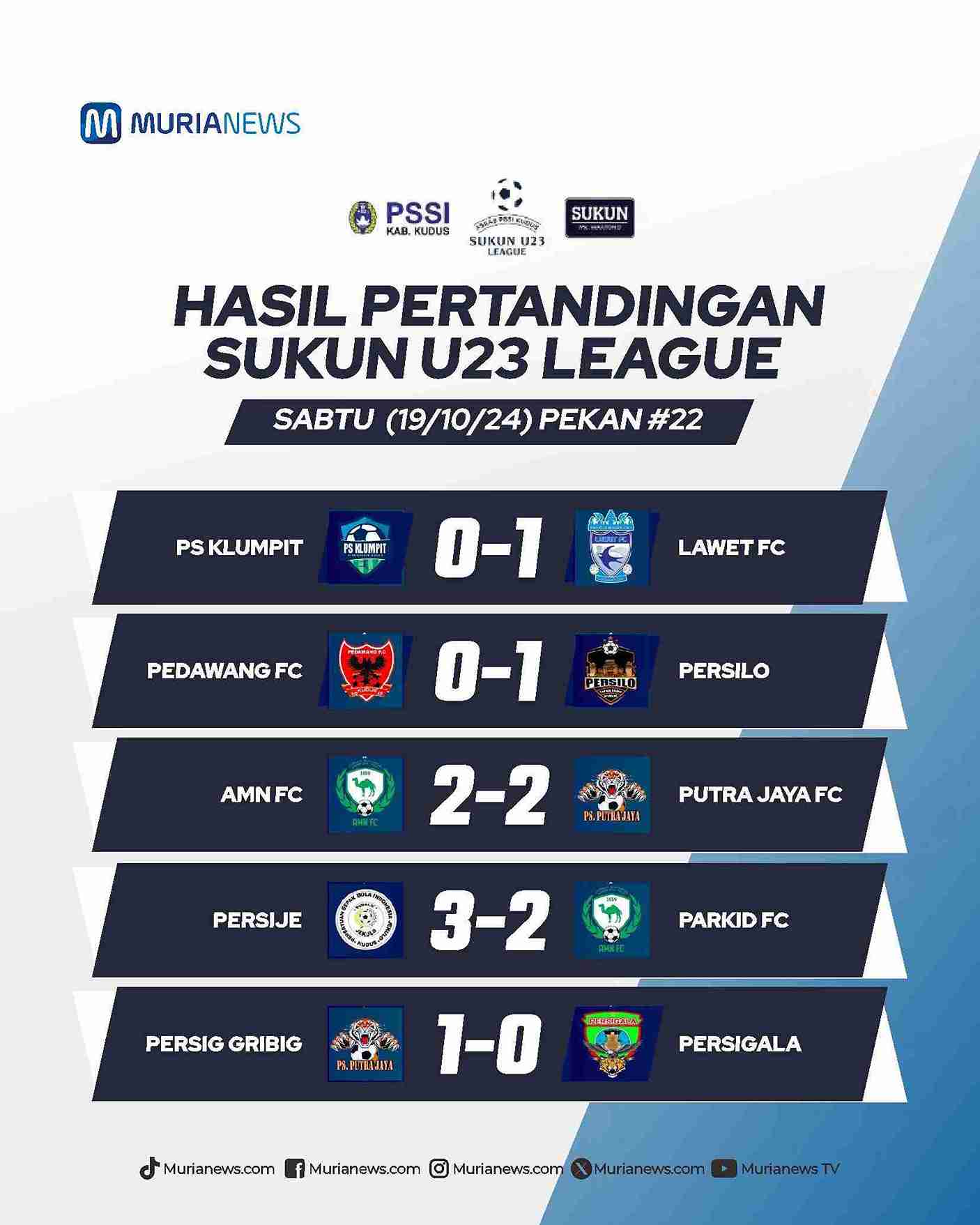 Murianews, Kudus – Lawet FC berhasil menang atas PS Klumpit pada pekan terakhir Liga 1 PSSI Kudus bertajuk Sukun U23 League di Lapangan Klumpit, Sabtu (19/10/2024) sore WIB.