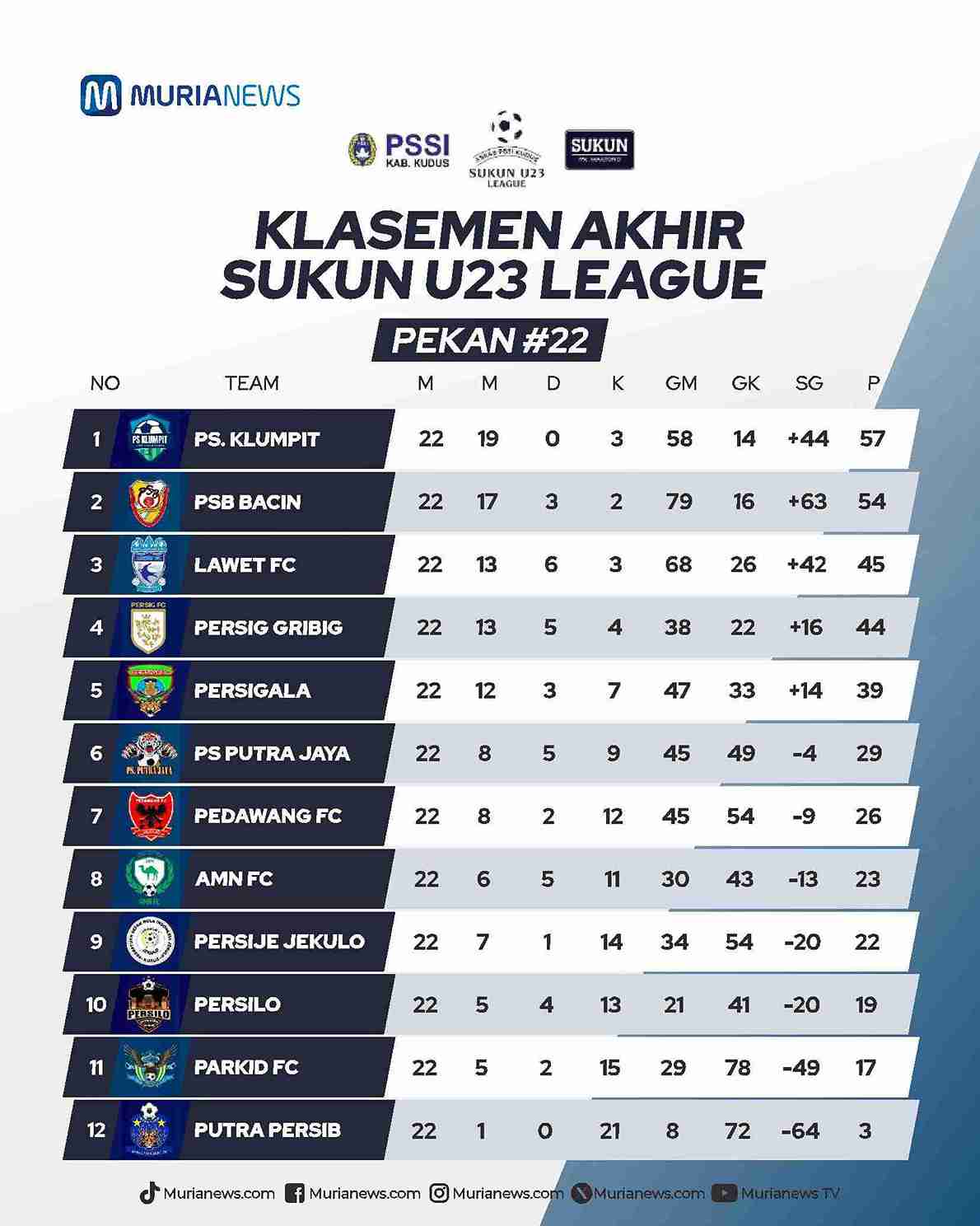 Murianews, Kudus – PS Klumpit berhasil menjadi juara Liga 1 PSSI Kudus bertajuk Sukun U23 League. Klub asal Desa Klumpit, Kecamatan Gebog, Kabupaten Kudus ini mengakhiri kompetisi dengan koleksi 57 poin.