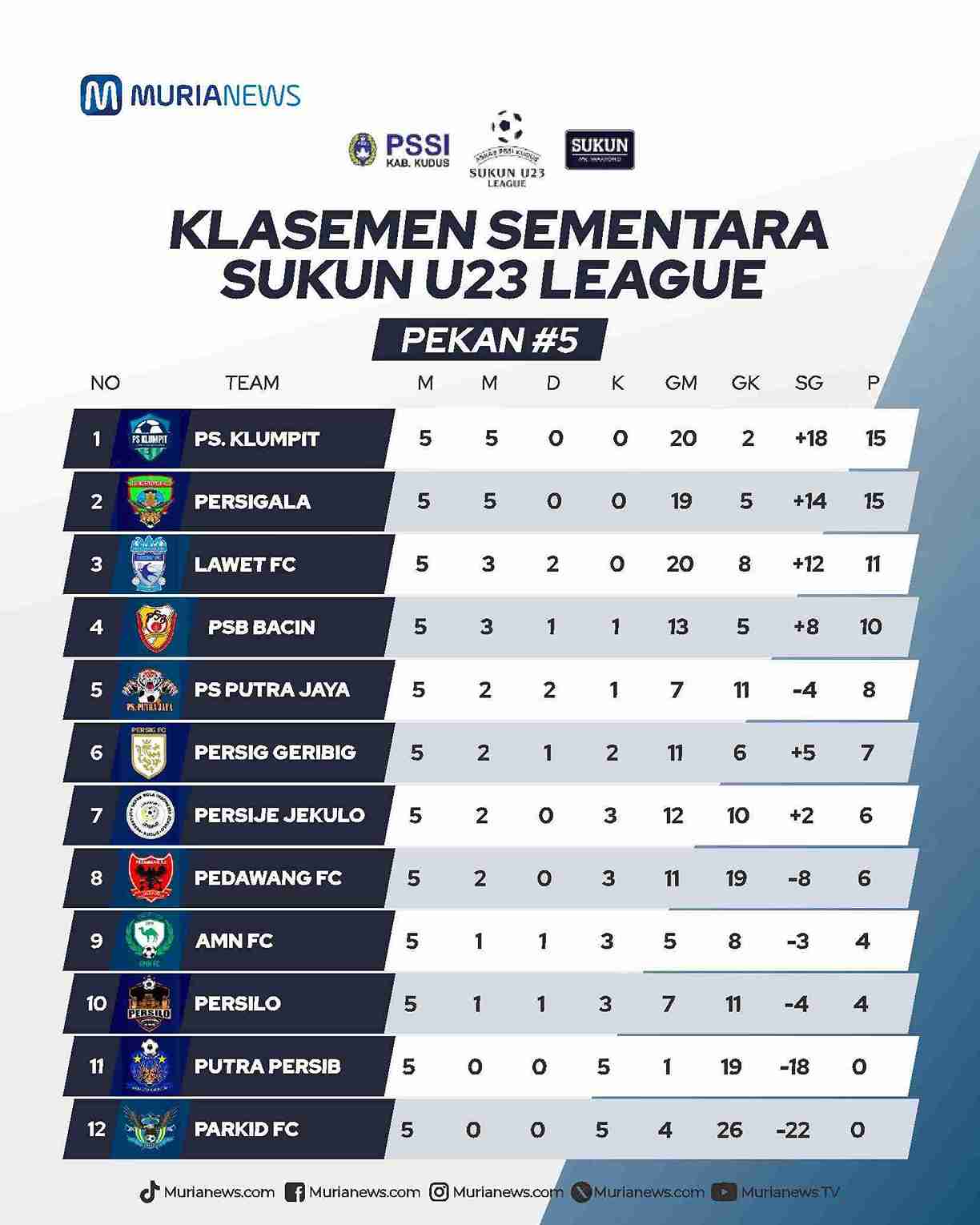Klasemen sementara Sukun 23 League masih dikuasai PS Klumpit yang berada di posisi pertama dengan raihan 15 poin. Disusul Persigala di peringkat kedua dengan poin sama 15, namun kalah selisih gol.
