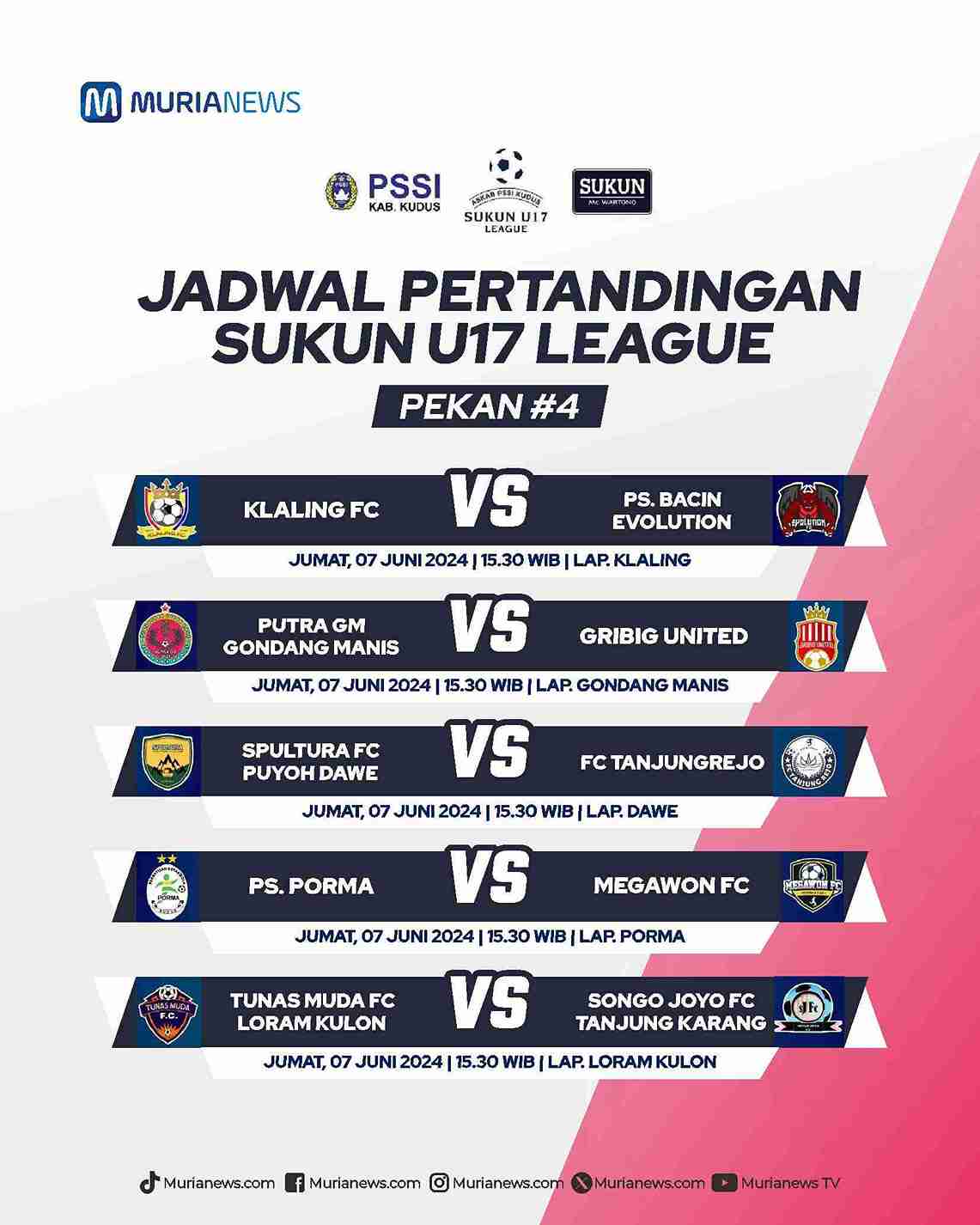 Murianews, Kudus – Kompetisi Liga 2 PSSI Kudus bertajuk Sukun U17 pekan keempat digelar hari ini, Jumat (7/6/2024). Sebanyak lima pertandingan dilangsungkan mulai pukul 15.30 WIB.