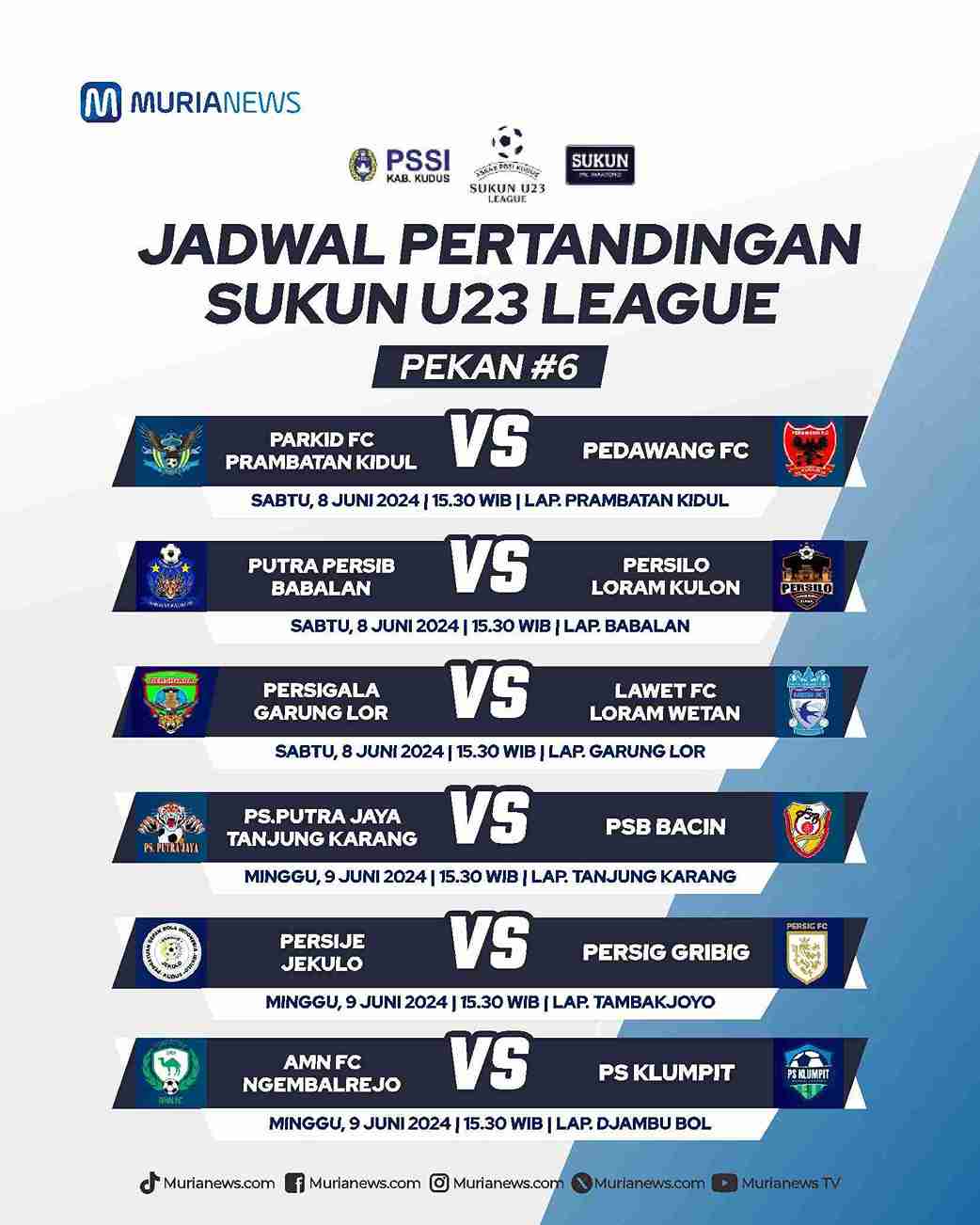Murianews, Kudus – Kompetisi Liga 1 PSSI Kudus bertajuk Sukun U23 League pekan keenam digelar pada Sabtu-Minggu (8-9/6/2024). Masing-masing, tiga pertandingan dari dua hari tersebut.