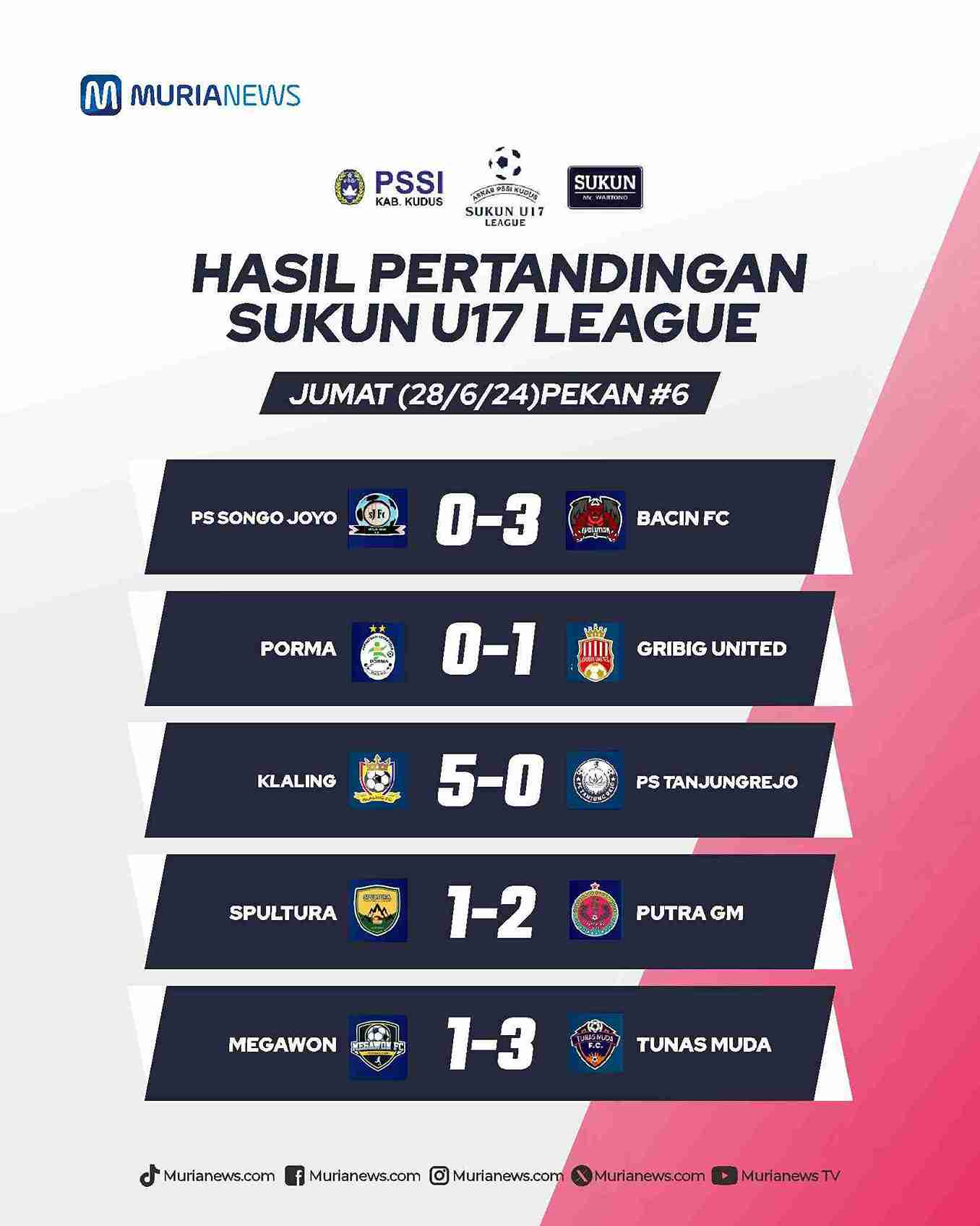 Kemenangan itu membuat Bacin FC mengantongi 16 poin, dan menjadi pemuncak klasemen sementara di pekan keenam Sukun U17 League.