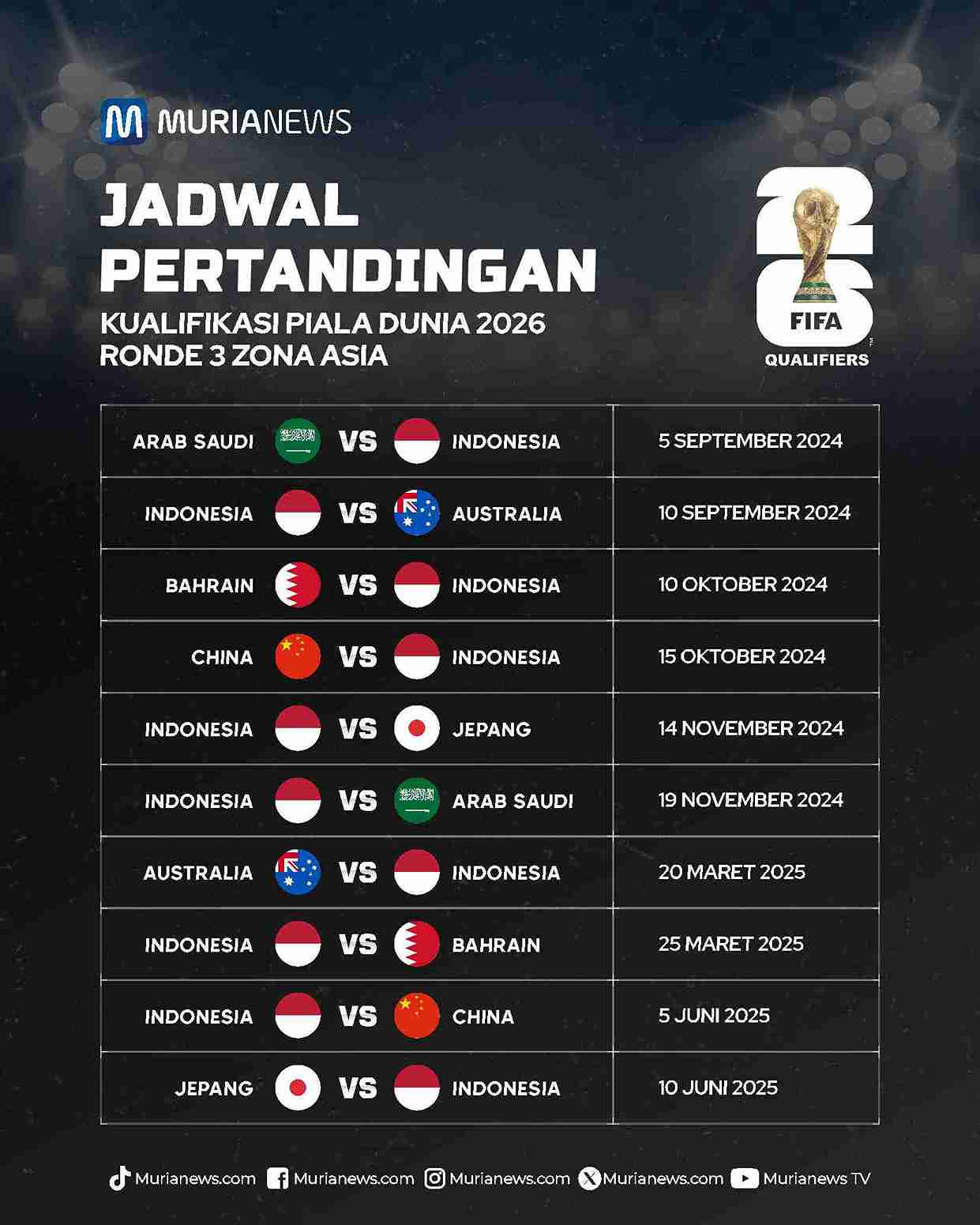 Selengkapnya, simak jadwal Timnas Indonesia di Babak Ketiga Kualifikasi Piala Dunia 2026 Zona Asia sebagaimana di lansir dari laman resmi AFC, sebagai berikut: